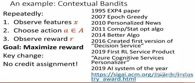 多臂老虎机的一个特别有用的版本是上下文多臂老虎机问题。在这个问题中,代理(学习者)必须在每次迭代之间进行选择。在做出选择之前,代理会看到与当前迭代关联的d维特征向量(上下文向量)。学习者使用这些上下文向量以及过去玩过的臂的奖励来选择要在当前迭代中玩的臂。随着时间的推移,学习者的目标是收集有关上下文向量和奖励如何相互关联的充足信息,以便它可以通过查看feature向量来预测下一个最佳手臂。[31]