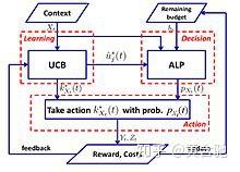 UCB-ALP算法:下图显示了UCB-ALP的框架。 UCB-ALP是一种简单的算法,将UCB方法与自适应线性规划(ALP)算法结合在一起,可以轻松地部署到实际系统中。这是第一部展示如何在受限的Contextual bandit中实现对数后悔的工作。尽管[41]专门针对单一预算约束和固定成本的特殊情况,但结果为更一般的CCB问题的算法设计和分析提供了启示。
