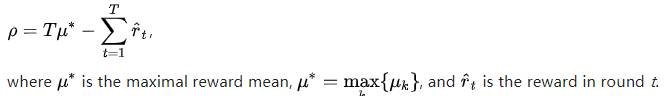 赌徒每轮反复play一个杆并观察相关的奖励。 目的是使所收集奖励总和最大化。 Horizon H是要播放的回合数。 老虎机问题在形式上等效于一个单状态的马尔可夫决策过程。T回合之后的遗憾 定义为采用最佳策略时的奖励总和与所收集奖励总和之间的预期差: